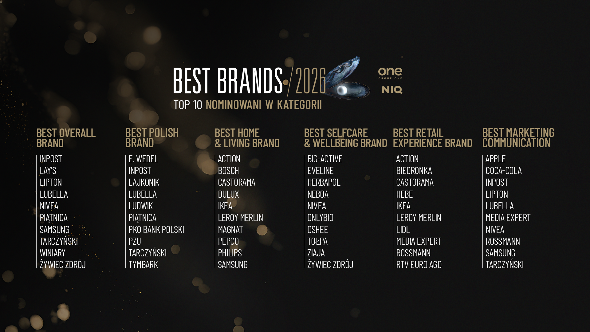 PKO Bank Polski, E.Wedel, Coca-Cola, Rossmann, IKEA, Media Expert, Oshee, Ziaja, Action i Lidl - to tylko część marek, które znalazły się w gronie 60 nominowanych w 5. polskiej edycji rankingu Best Brands Poland, organizowanego przez Group One i NIQ. W każdej z sześciu kategorii konsumenci wyłonili TOP 10 marek, które powalczą o tytuł „Oscarów Marketingu”. Laureatów poznamy 7 maja podczas finałowej gali Best Brands Awards 2026.
